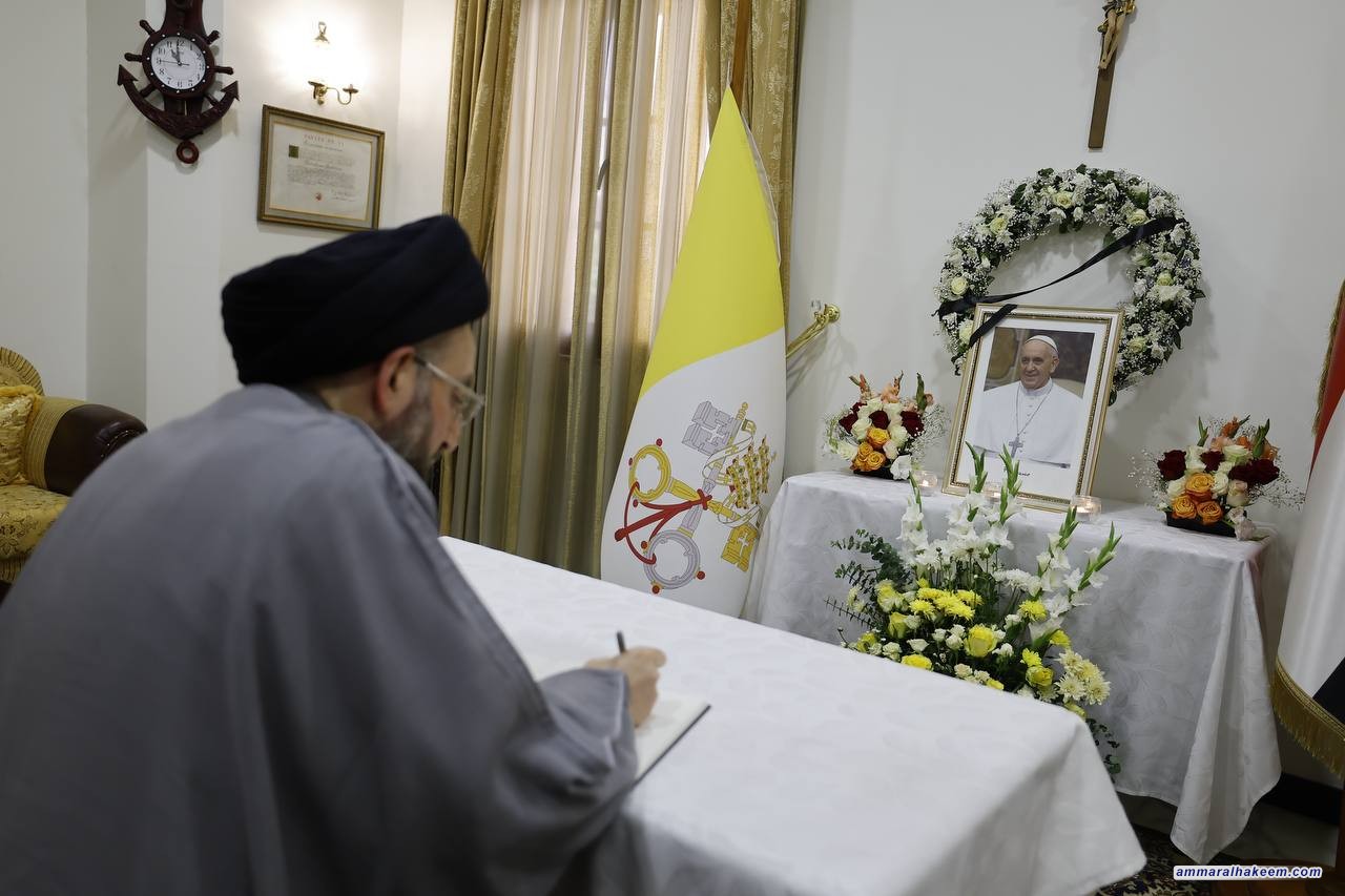 السيد الحكيم يعزي بوفاة قداسة البابا فرنسيس ويشيد بإرثه في ترسيخ التعايش بين الأديان