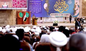 وقال في معرض كلامه "رسولنا الكريم ملتقى وحدة المسلمين، وإذا أردنا الوحدة بين المسلمين فعلينا أن نلتقي ونتمحور حول شخصية رسول الله "صلى الله عليه وآله وسلم"، وأن الإصلاح الحقيقي لايتم إلا باتباع منهجه القويم، ومدخله الأخلاق، فالأخلاق تمثل المفتاح الحقيقي للإصلاح، ولذلك جاءت الدعوة الإسلامية بمضمون أخلاقي" مبينا إن سياسة الاستهداف لشخص النبي (صلى الله عليه وأله وسلم) ورسالته ما زالت مستمرة ومتجددة، ومنها حرق القرآن الكريم تحت يافطة الحرية، وانتهاك حرمة رسول الله في صور مسيئة وازدراء عقيدة المسلمين وغيرها كلها إشارات لهذا المنهج المتواصل والمتجدد.