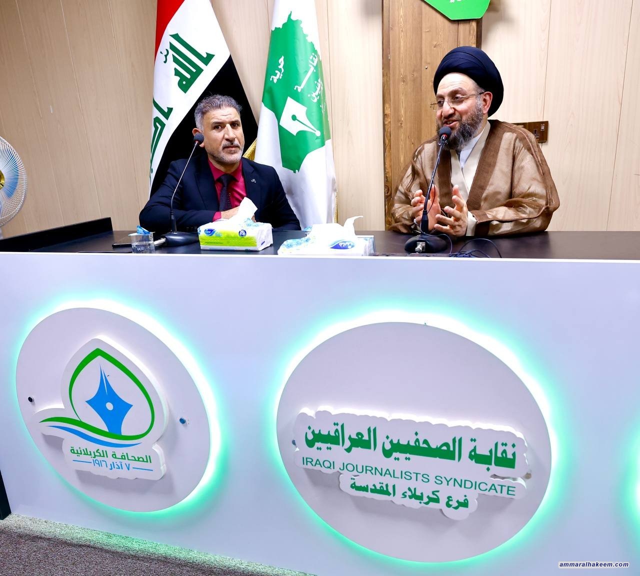 نقابة الصحفيين العراقيين فرع كربلاء المقدسة كانت محطة مهمة خلال زيارة السيد عمار الحكيم رئيس تيار الحكمة الوطني للمحافظة حيث التقى عددا من الصحفيين مؤكدا أهمية الإعلام في صناعة أي مشروع، وبيّن أن المرحلة تتطلب التركيز على الإيجابيات وما تحقق من إنجازات لمعادلة حالة الإحباط والتشاؤم التي تقف خلفها أجندات إعلامية حاولت أن تشيطن كل شيء.