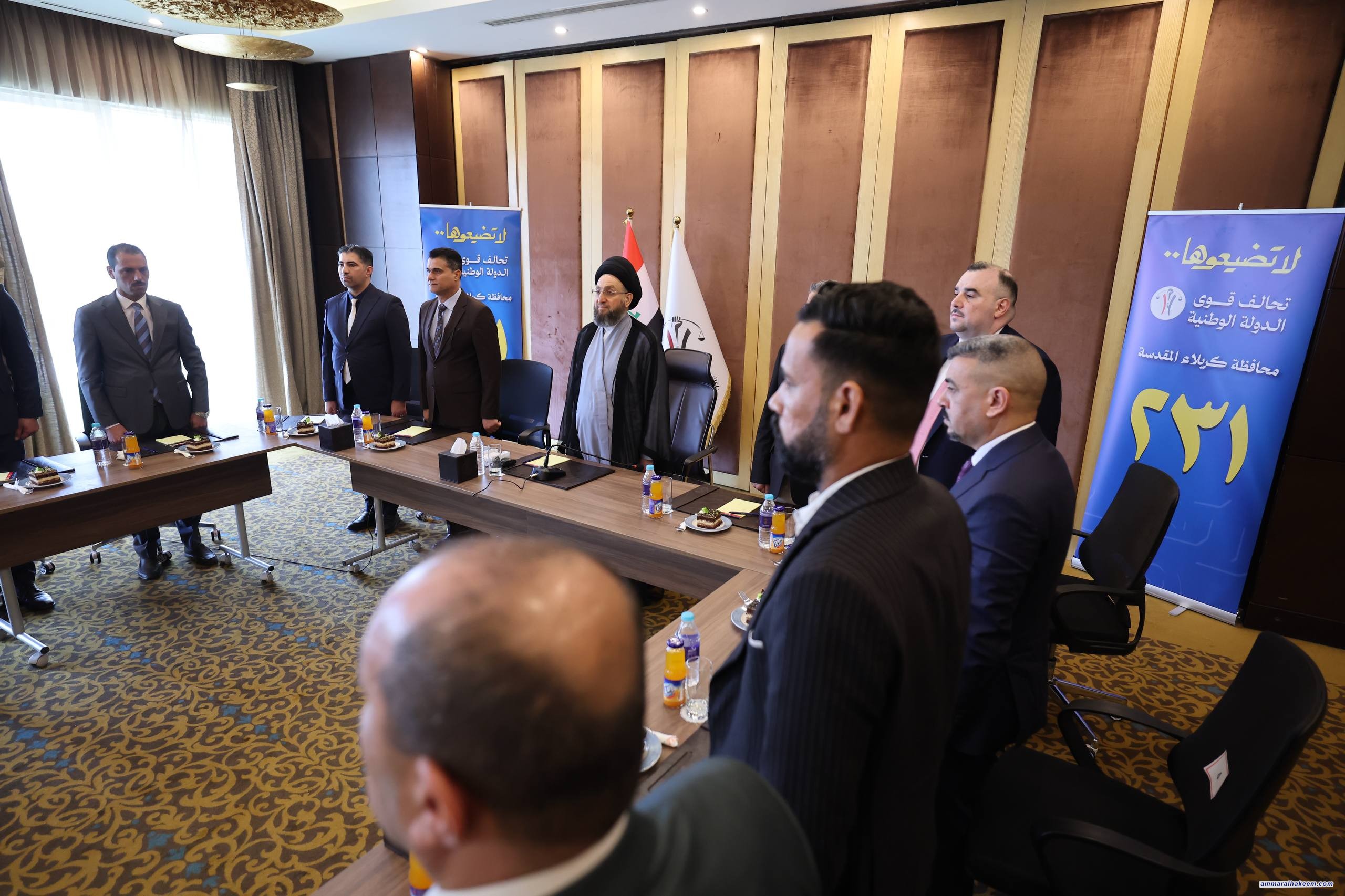 من كربلاء المقدسة، التقى سماحةُ السيد الحكيم، رئيسُ تحالف قوى الدولة الوطنية، بمرشّحي التحالف في المحافظة. وأشار سماحته في حديثه — بعد أن استمع إلى مداخلات الحضور — إلى أهمية الانتخابات القادمة عطفًا على توقيتها، وعلى الأوضاع التي شهدتها المنطقة في الفترة الماضية، قائلاً: إنّ العراق تعاطى مع قضايا المنطقة وتفاعل معها دون الانغماس فيها، فيما بيّن سماحته أن تمكين منهج الاعتدال والوسطية سيسهم في تعزيز استقرار العراق وتغليب منطق المشاريع والبرامج.