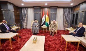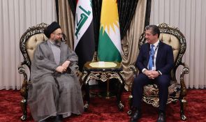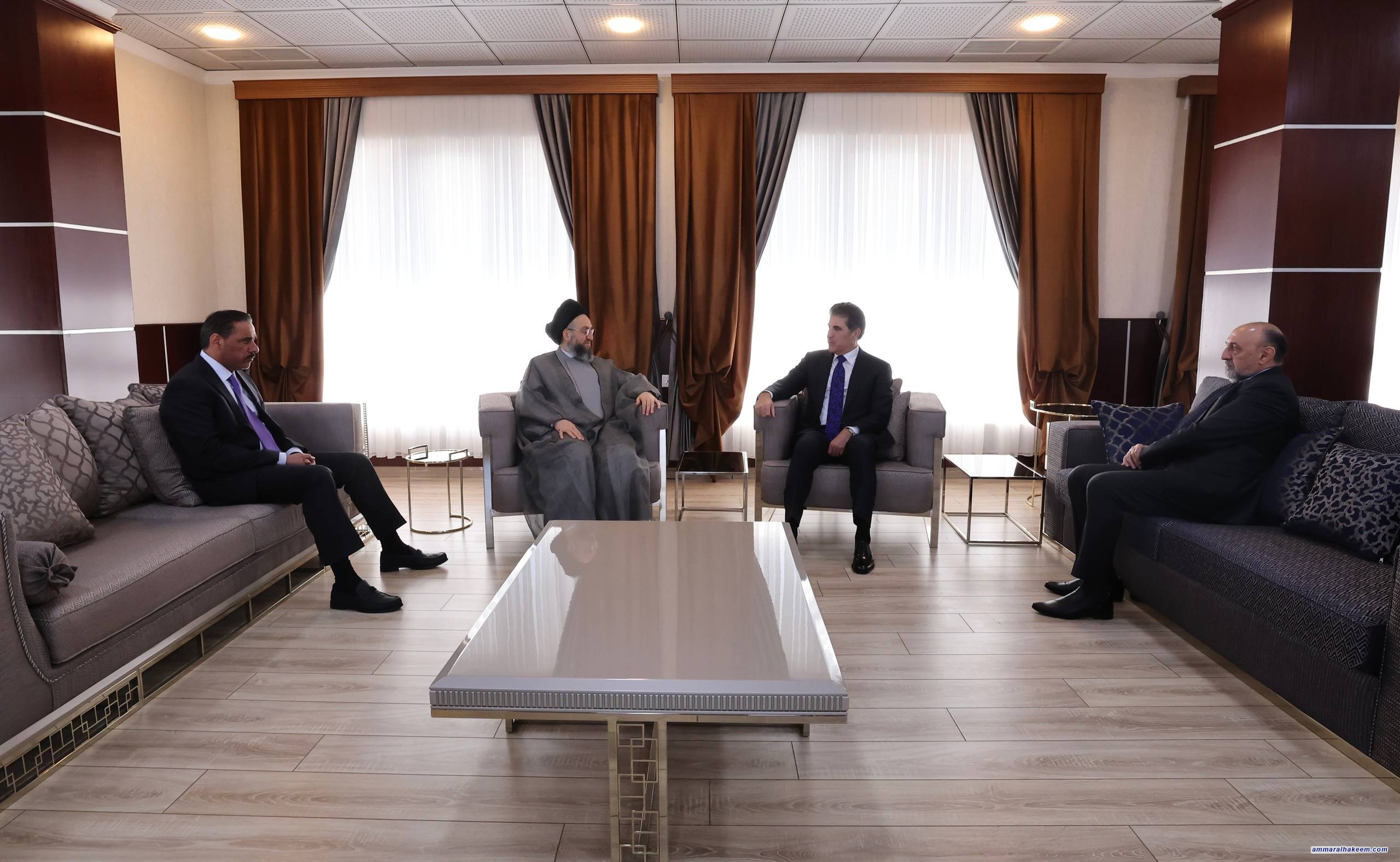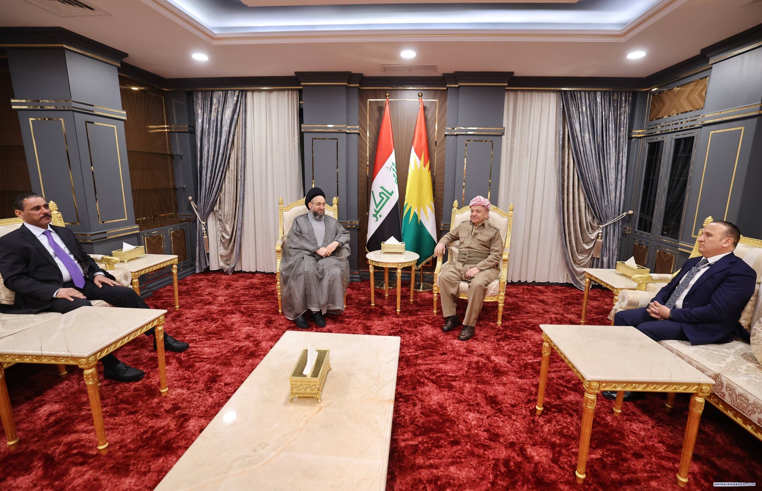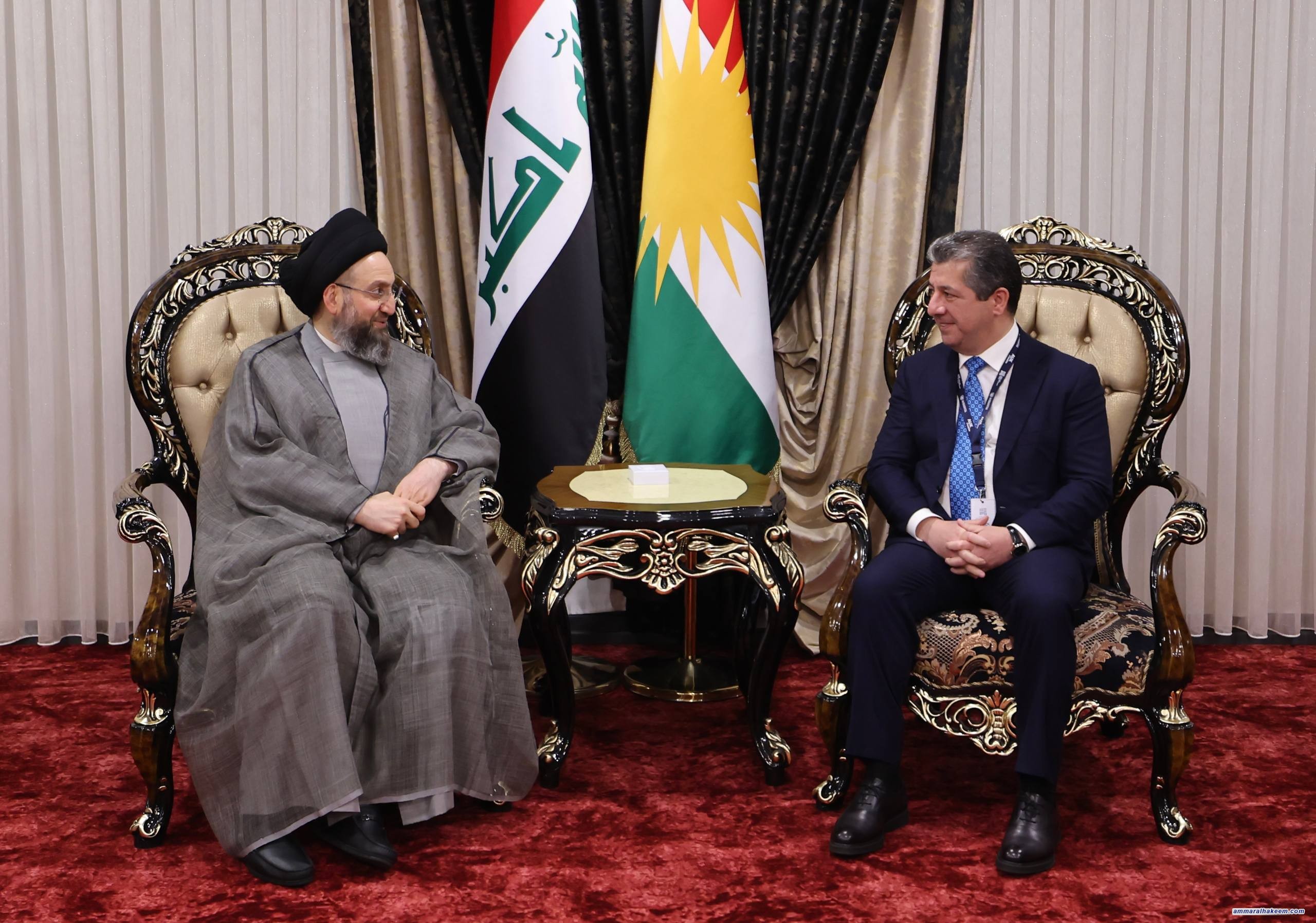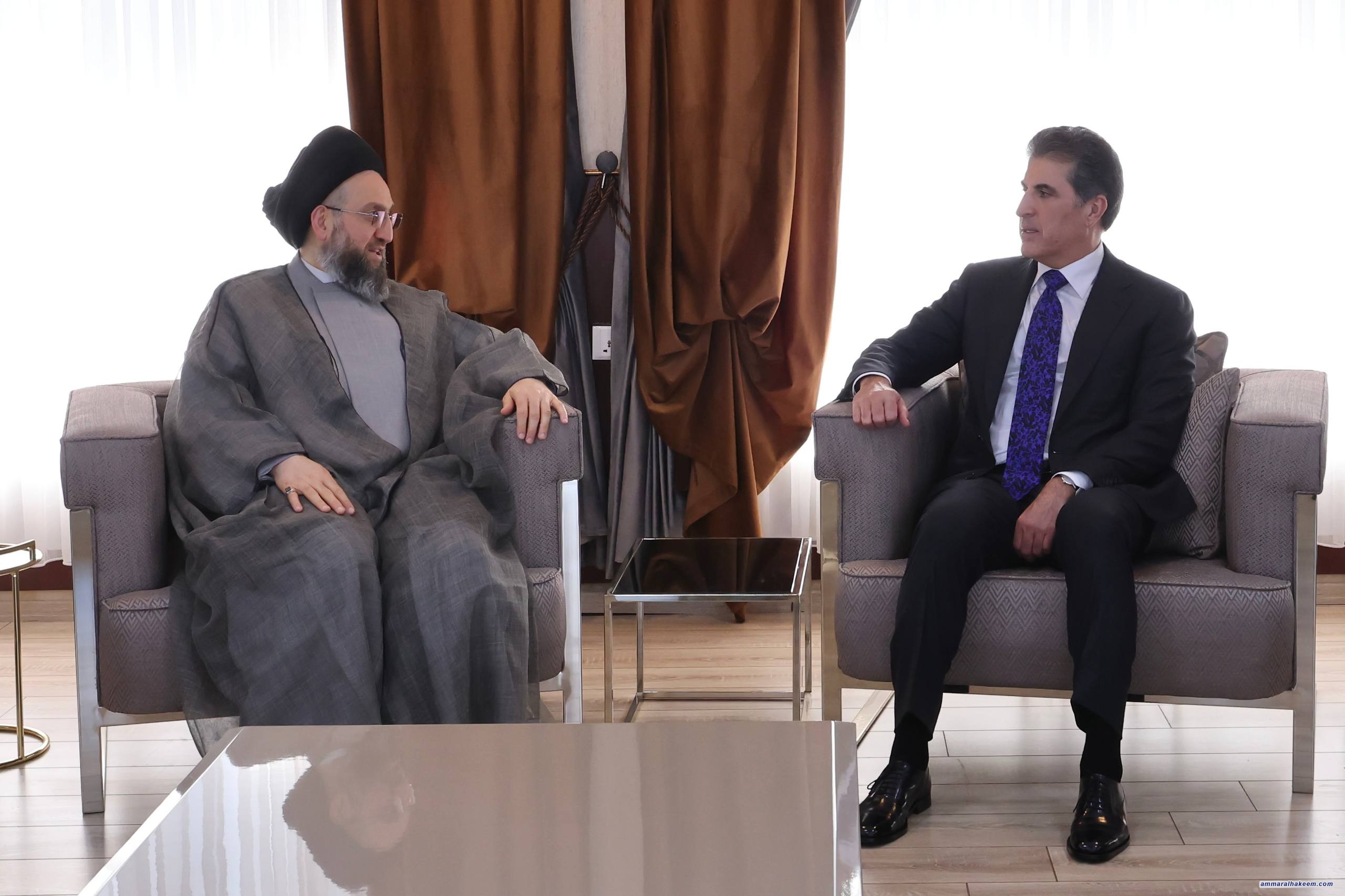 على هامش أعمال المنتدى السادس للسلام والأمن في الشرق الأوسط في محافظة دهوك، التقى سماحة السيد الحكيم، رئيس تحالف قوى الدولة الوطنية، بفخامة الرئيس مسعود بارزاني، والأستاذ نيجرفان بارزاني، رئيس إقليم كردستان العراق، والأستاذ مسرور بارزاني رئيس حكومة الإقليم، حيث جرى تبادل التهاني بنجاح الانتخابات البرلمانية الأخيرة، والصورة الوضاءة التي قدّمها الشعب العراقي في كل مكان عن تجربته الديمقراطية، وتمسّكه بالاحتكام لصندوق الاقتراع لتحديد ممثليه.